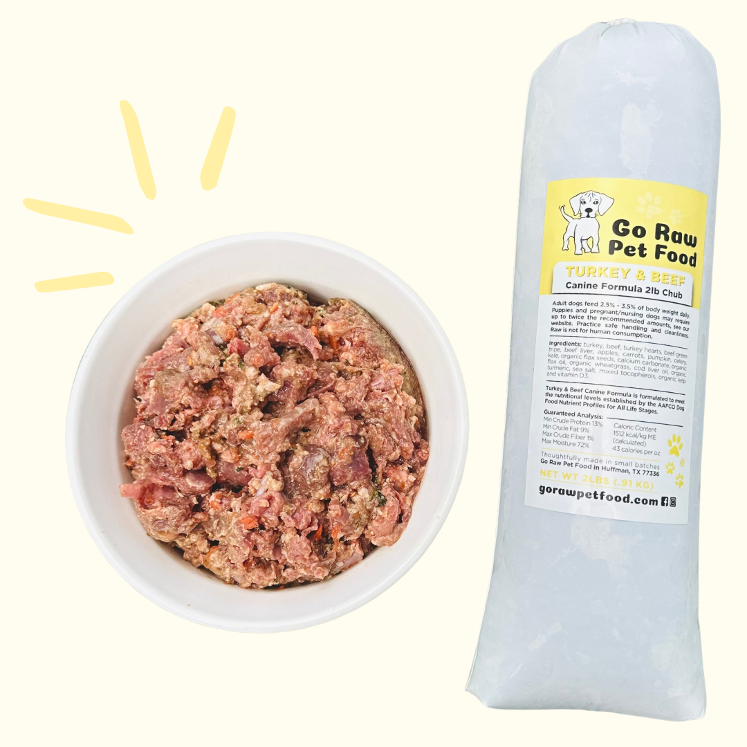 Turkey & Beef Raw is a complete raw formula made in 2lb chubs with USA-sourced proteins. It's packed with nutrient dense proteins, organs, produce, and superfoods for your dog to thrive.
